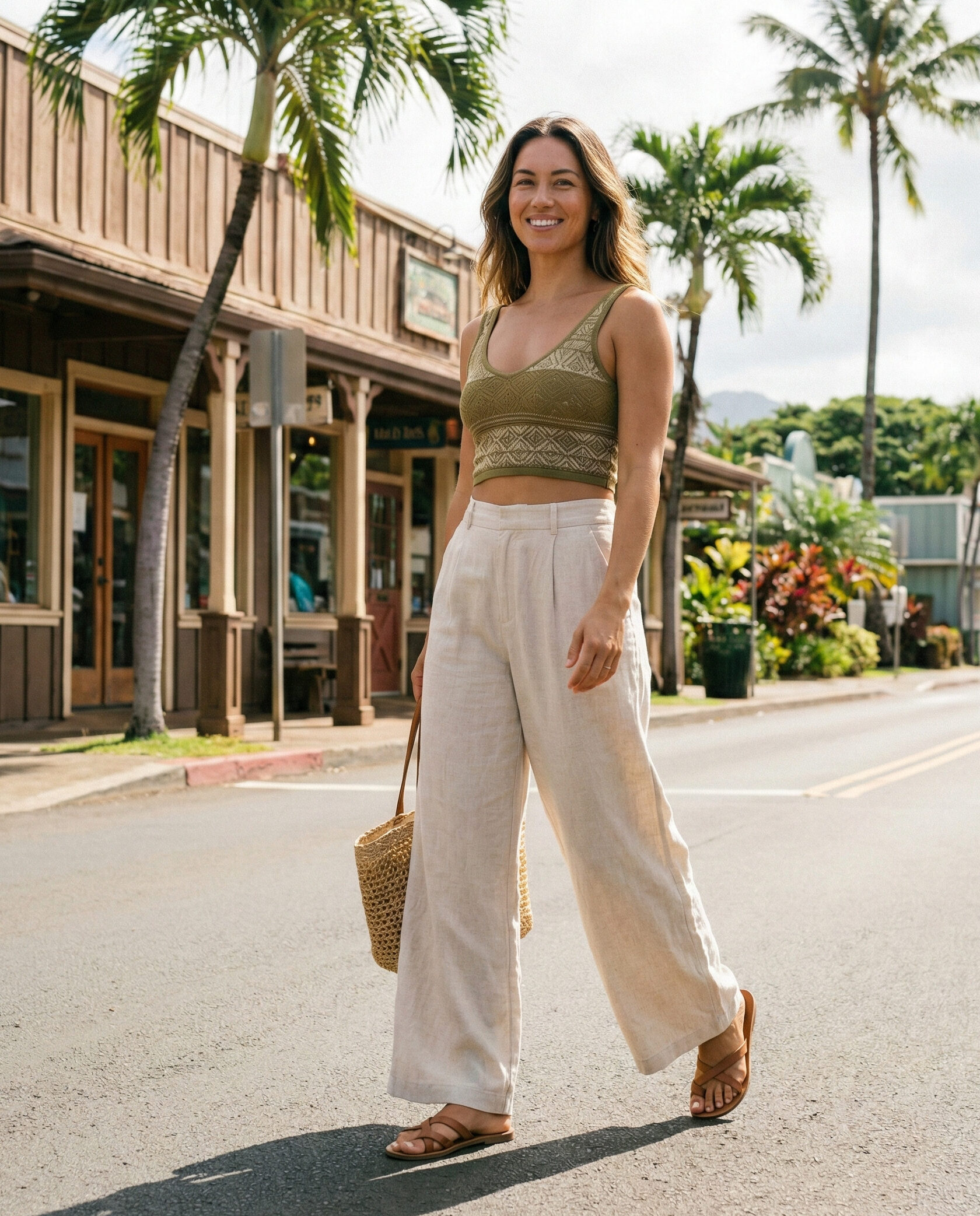 Wide-leg pants offer airflow and comfort in warm weather. Pair them with a fitted crop top to balance the silhouette. This outfit feels stylish yet relaxed, ideal for sightseeing or casual dinners in Hawaii.