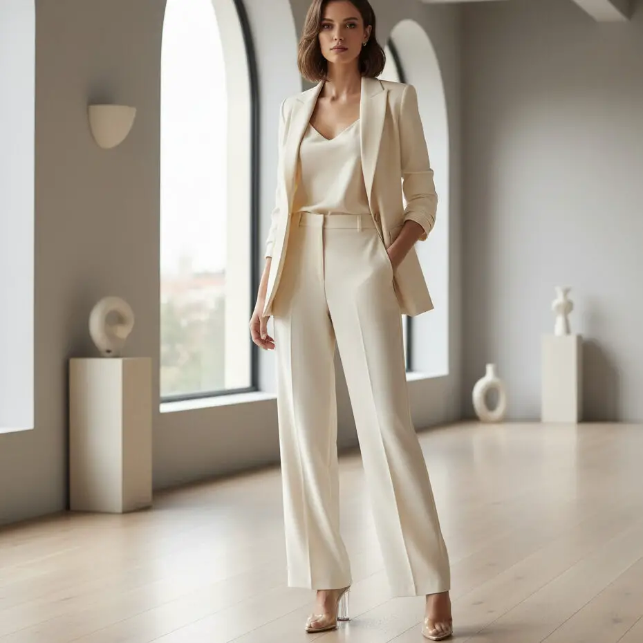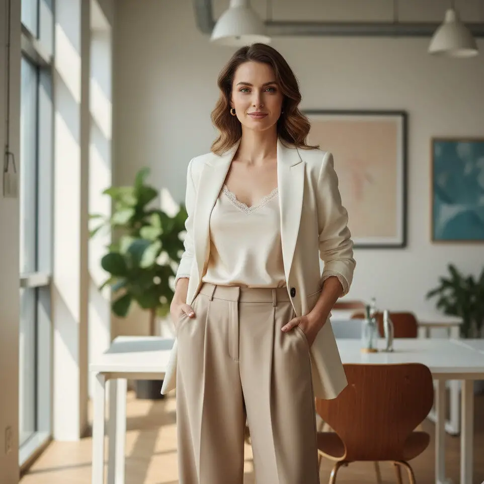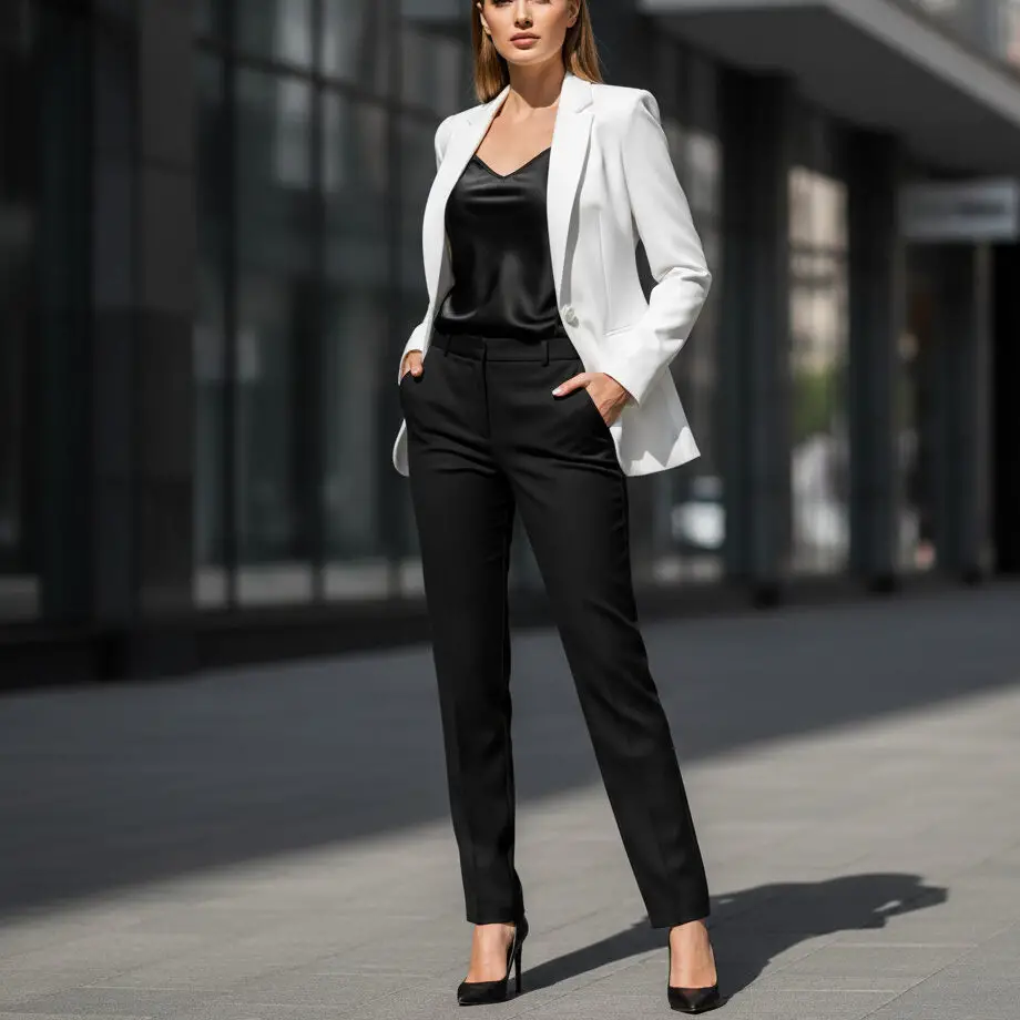 Pair a white blazer outfit with beige trousers and a silk cami. Add structured tote for classy business outfits that radiate quiet power and modern professionalism.
