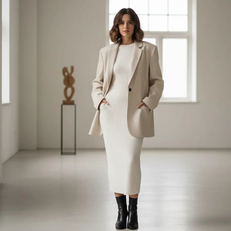 Combine a cream blazer outfit with a white knit dress and ankle boots. Add a statement necklace for soft, tonal layering perfect for transitional seasons.