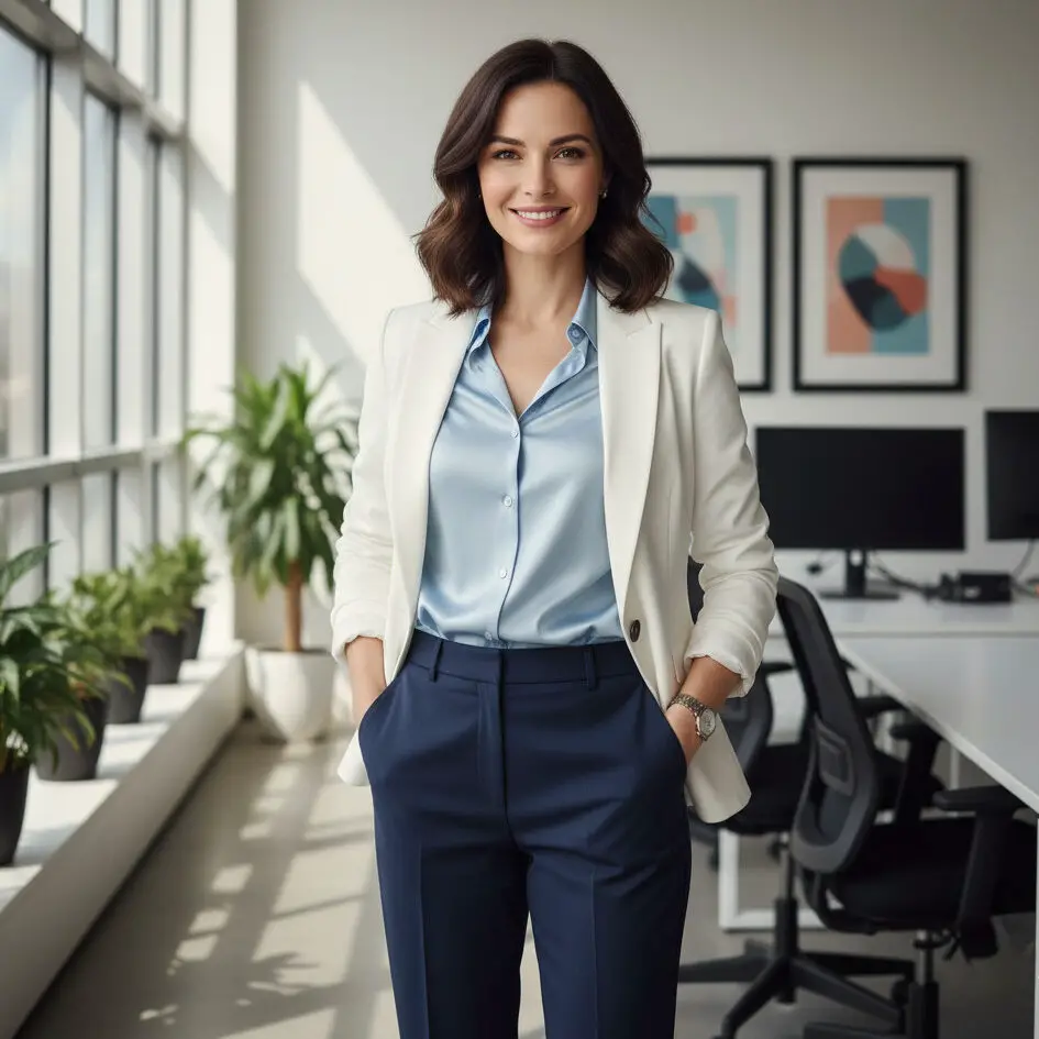 Try a white blazer outfit with tailored navy pants, a blue blouse, and nude pumps. Add pearl studs for classy business outfits that never fail to impress.