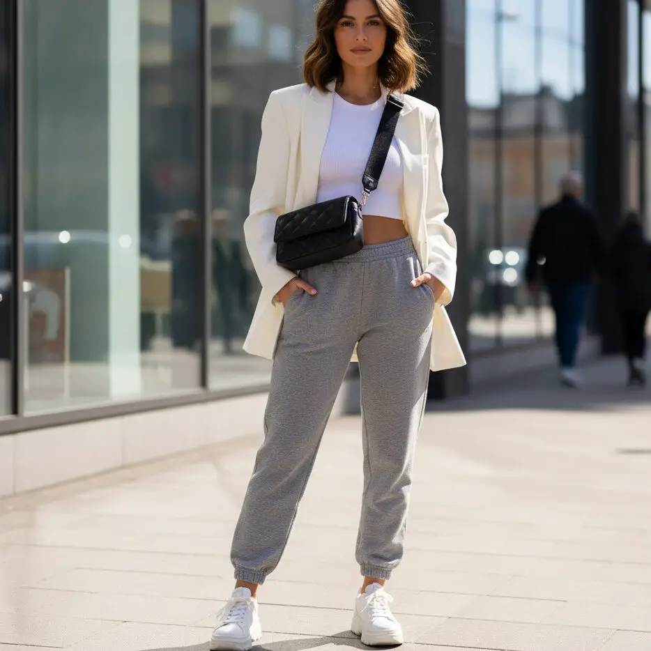 Pair a white oversized blazer with joggers, a crop top, and sneakers. Add a baseball cap for an elevated streetwear twist that merges structure with comfort.
