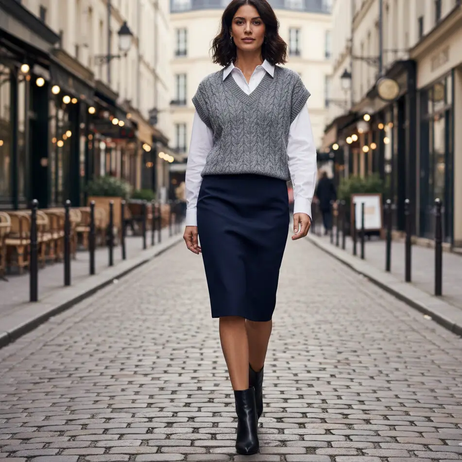 Layer a sleeveless sweater vest over a crisp blouse. Tuck into a pencil skirt and finish with ankle boots. A subtle twist that upgrades stylish work attire for winter.