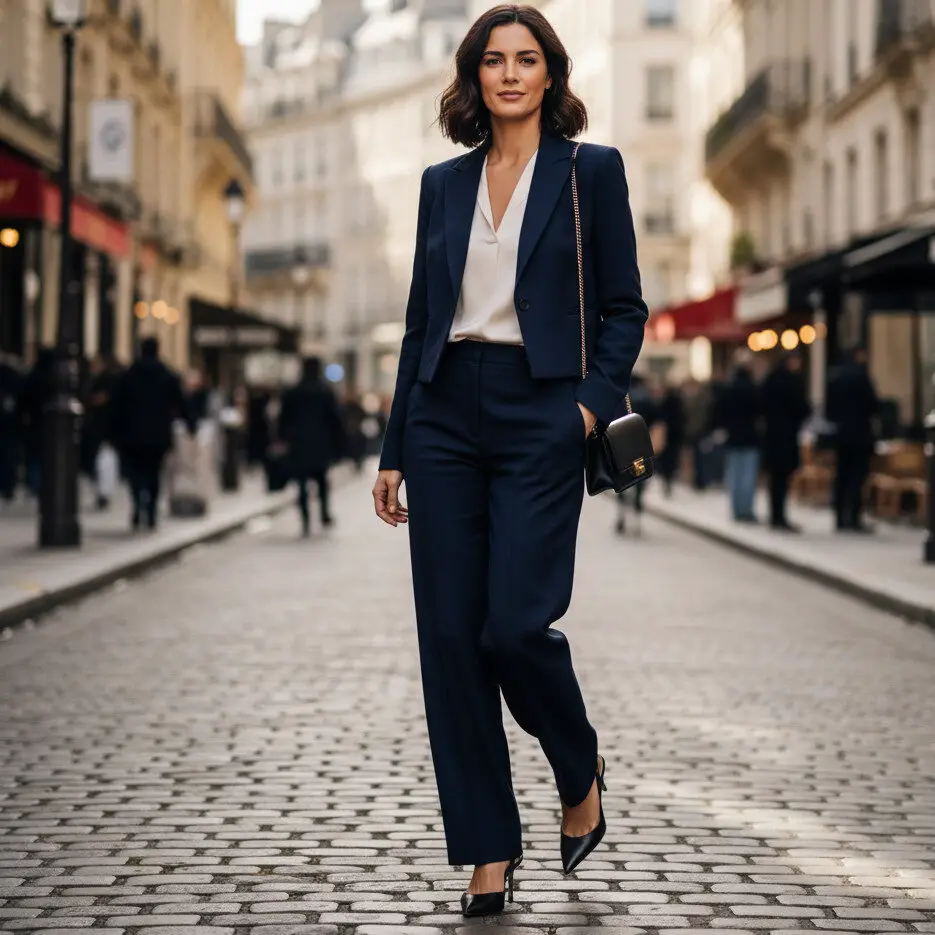 A cropped blazer over a silky blouse tucked into high-waist trousers elongates the frame. Add slingback heels and a crossbody. Perfect as stylish work outfits that feel trend-forward yet office-appropriate.