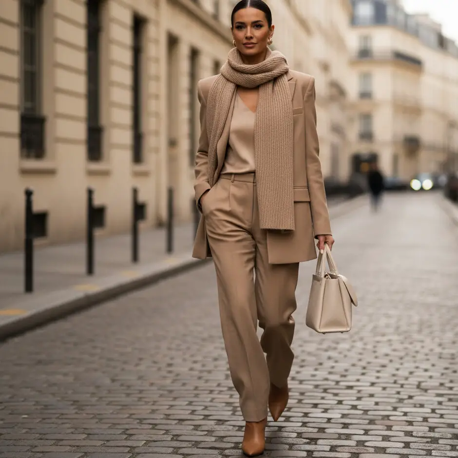 Choose a neutral suit in beige or grey and layer with a cashmere scarf. Pointed boots and structured bags make it feel luxe. Ideal for corporate baddie vibes without being too bold.