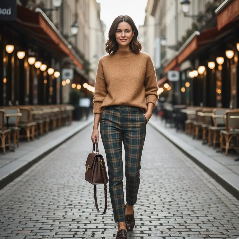 Pair a camel cashmere sweater with plaid cigarette pants. Add loafers and a satchel. It’s cozy, chic, and one of the most versatile business casual winter outfits for women.