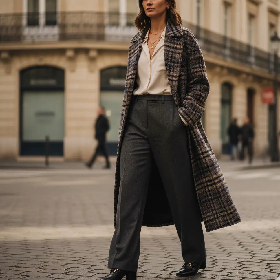 Layer a plaid coat over a silk blouse tucked into wide-leg pants. Finish with heeled loafers and minimalist jewelry. It’s a smart casual work outfit women can wear from the office to dinner.