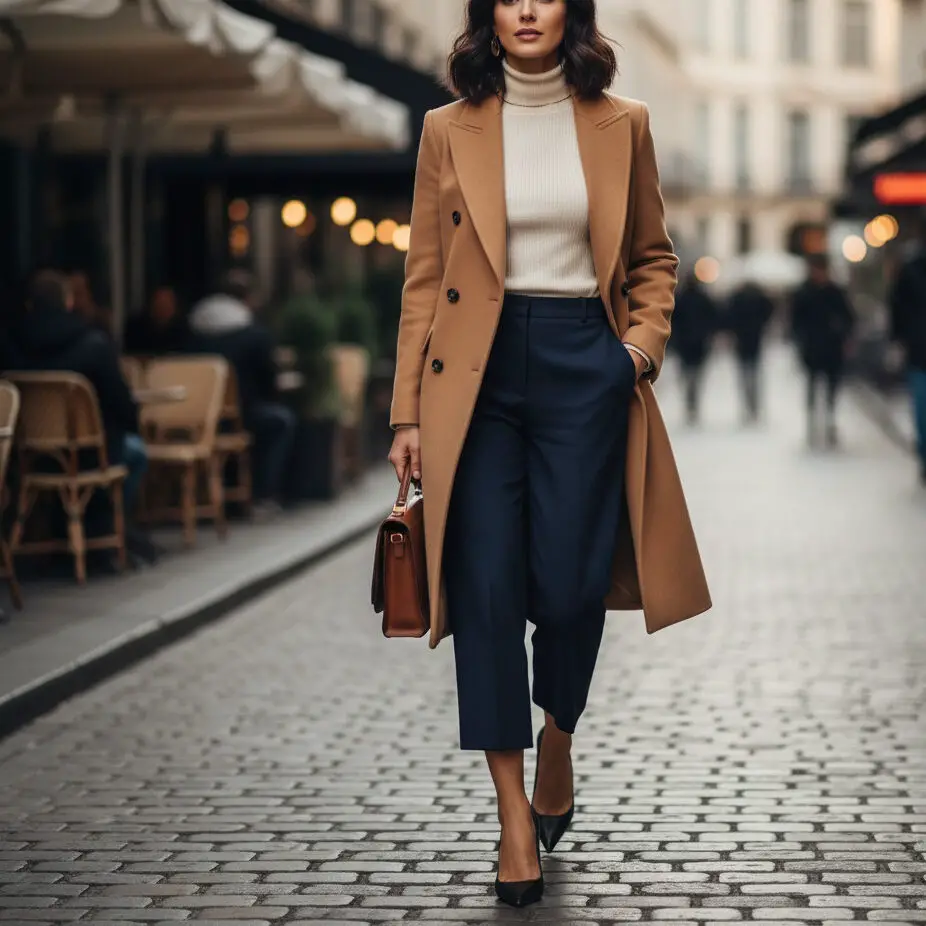 A structured wool blazer over a fitted turtleneck creates a polished base. Add slim tailored trousers, ankle boots, and a leather tote. This outfit hits that sweet spot between stylish work attire and cozy winter comfort.