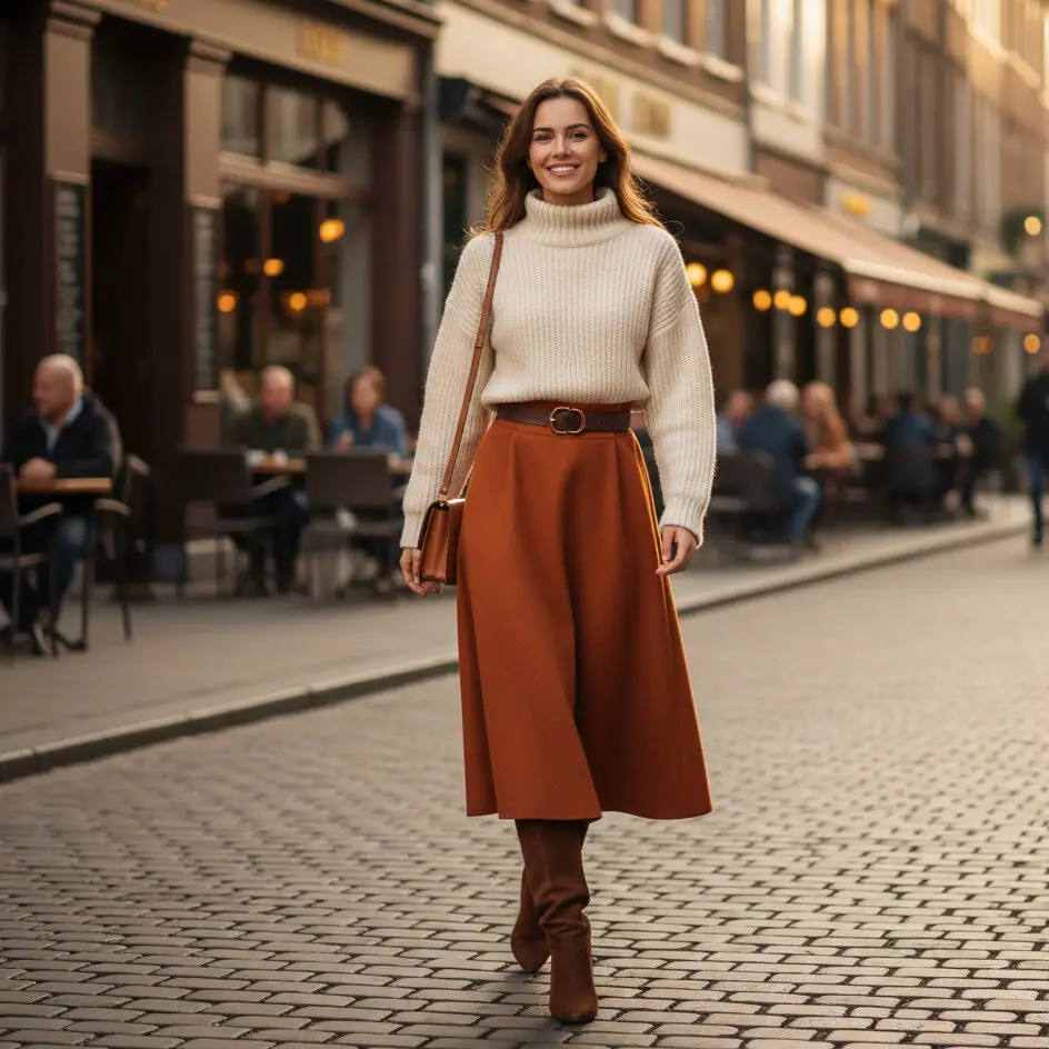 Pair a chunky knit sweater with a wool midi skirt for texture contrast. Add knee-high boots and a belt to define the waist. A great option for business casual winter outfits for women seeking warmth with elegance.