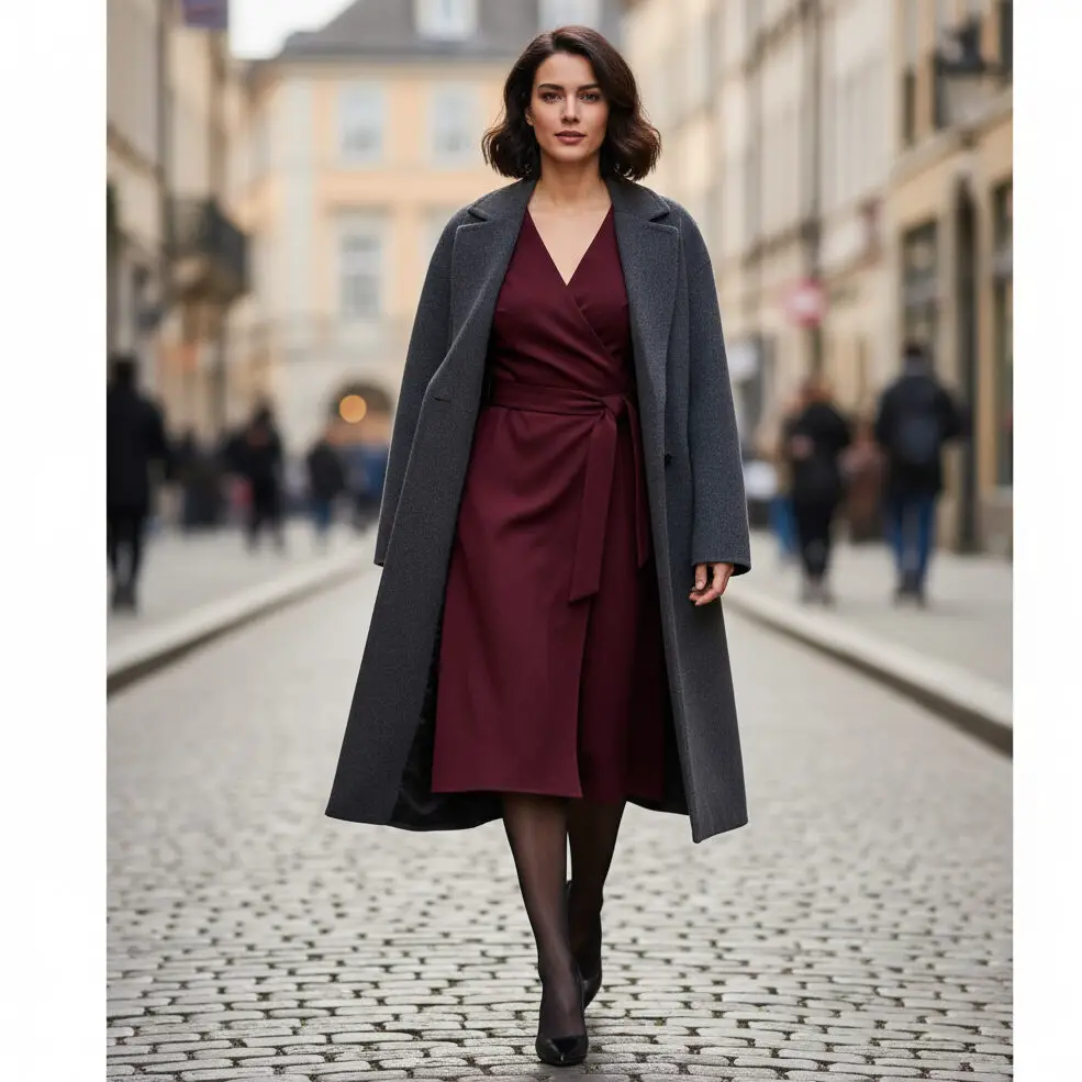 A wrap dress layered under a wool coat is timeless. Pair with sheer tights and pointed pumps. Works beautifully as a winter office outfit women can wear to formal meetings.