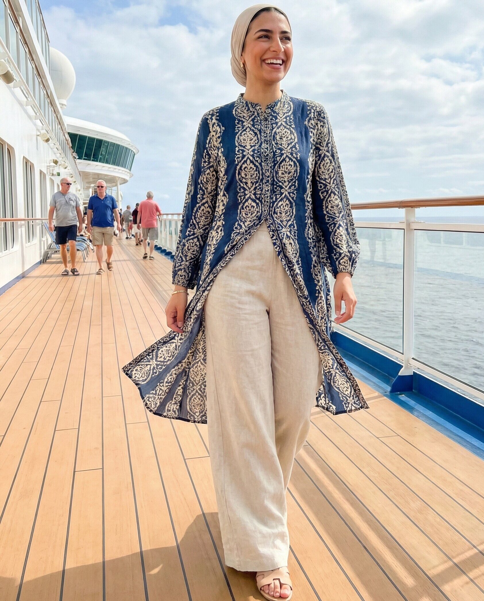 Cropped wide pants paired with a long tunic create a balanced, modest outfit. The tunic adds coverage, while the pants keep the look fresh and breathable. This combination is great for casual cruising and daytime onboard activities.