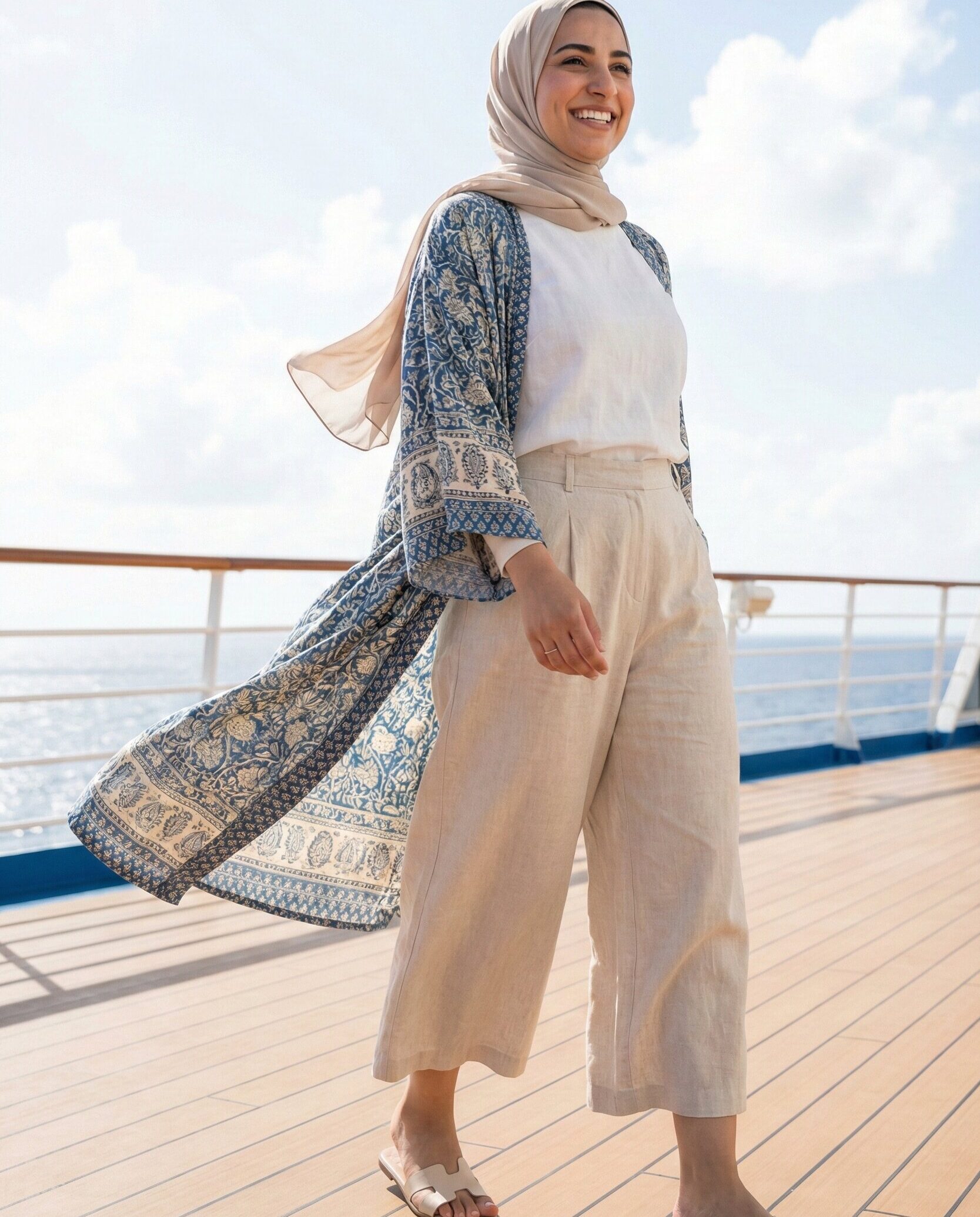 Wide-leg culottes provide comfort and modest length, while a long kimono adds elegance and coverage. This layered outfit is perfect for breezy deck walks and creates a relaxed yet fashionable cruise look that feels light and sophisticated.