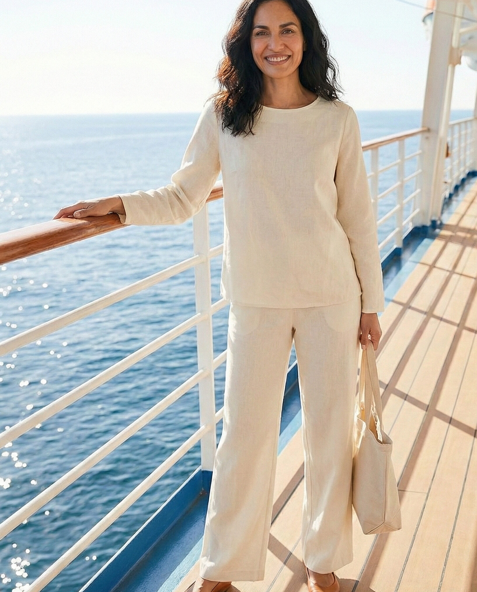 Linen wide-leg pants keep you cool and comfortable on humid cruise days. A loose long-sleeve blouse adds modest coverage while maintaining breathability. This outfit is ideal for sightseeing stops or relaxed onboard lunches with a refined, effortless appearance.