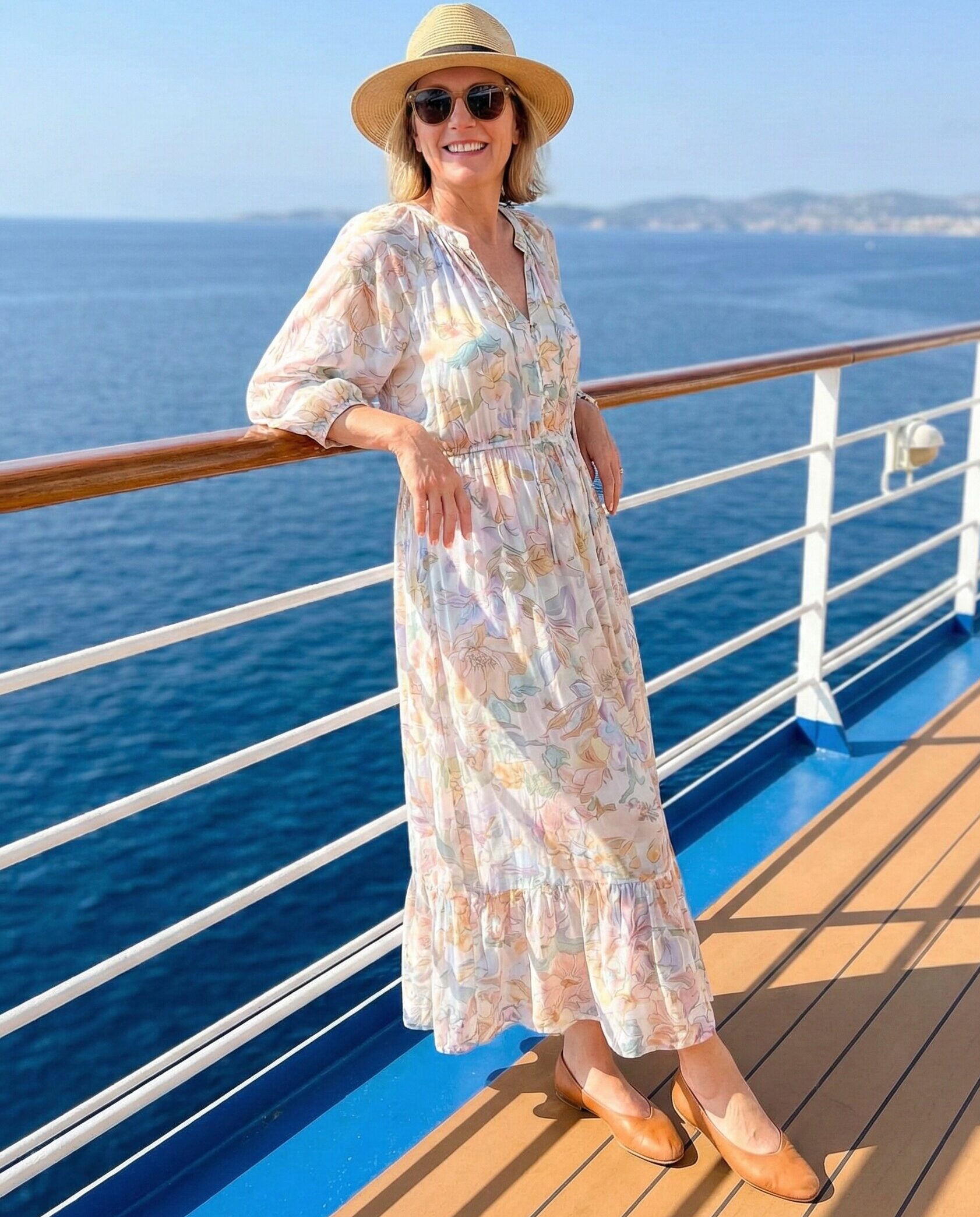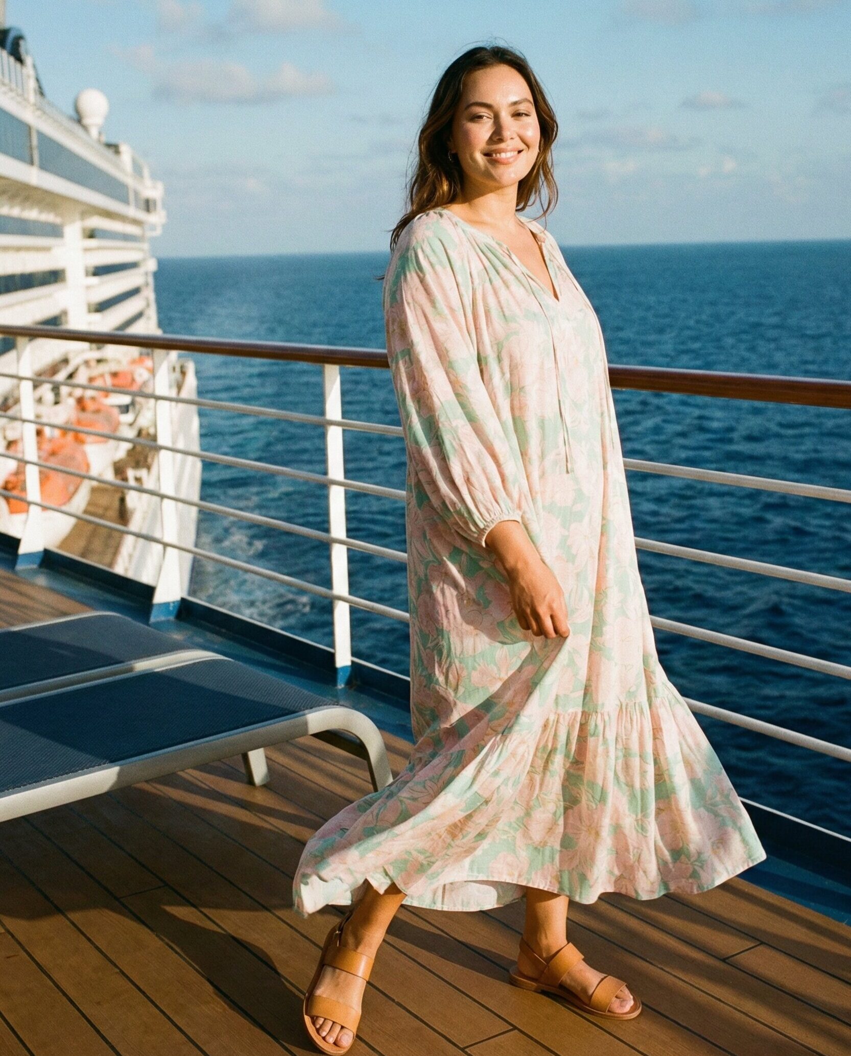 A printed maxi dress adds visual interest while keeping coverage intact. Neutral flats ensure comfort for walking around the ship. This outfit is effortless and stylish, ideal for daytime cruising, onboard events, or relaxed shore excursions.