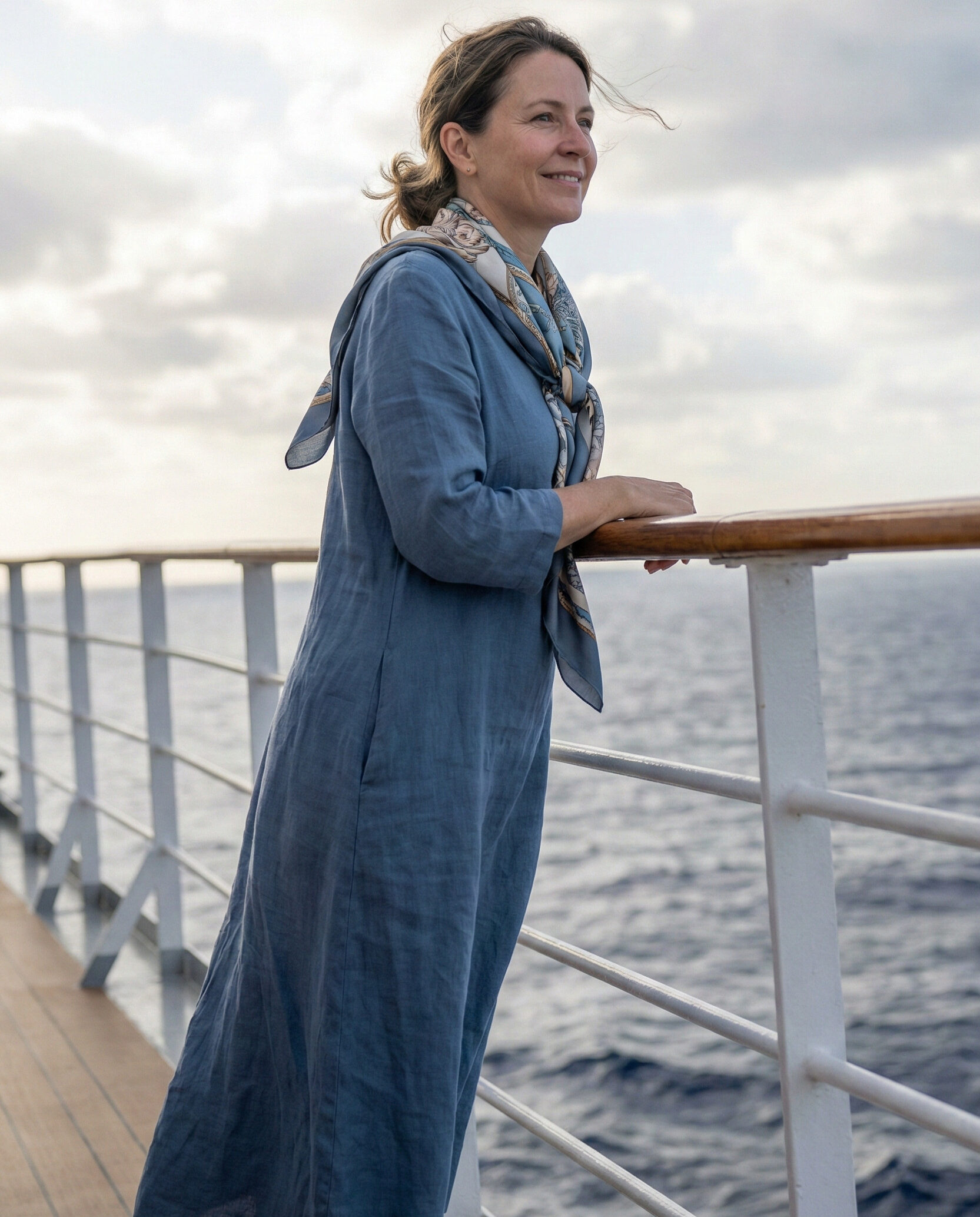 An ankle-length dress provides full coverage while remaining airy. Adding a light scarf offers versatility and extra modesty when needed. This outfit is ideal for breezy decks, dining areas, or cultural excursions during cruise stops.