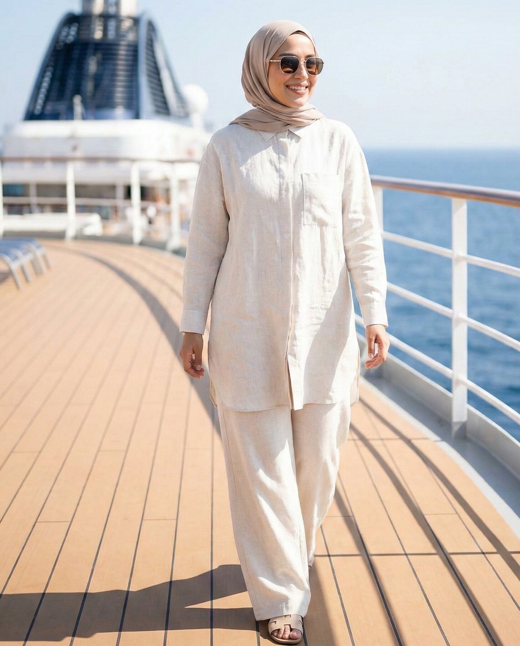 A matching modest set creates a coordinated and effortless cruise outfit. Monochrome colors look sophisticated while flats ensure comfort. This outfit is ideal for relaxed days onboard, offering simplicity, elegance, and easy styling throughout your trip.