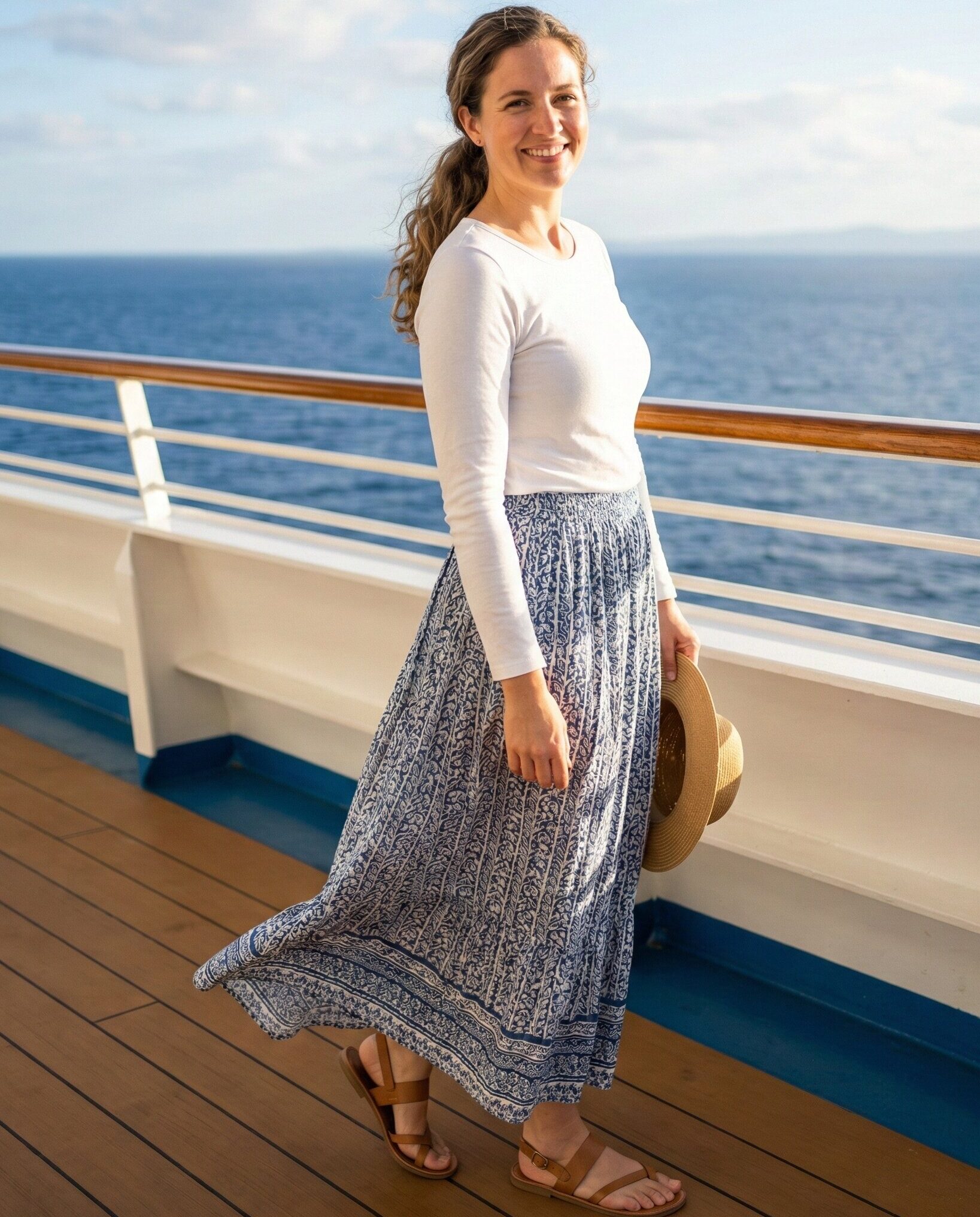 A lightweight flowy maxi dress is perfect for cruising in warm weather. It provides full coverage while allowing airflow. Pair it with flat sandals for comfort during deck walks or casual dining, creating an elegant yet relaxed look suitable for daytime activities.