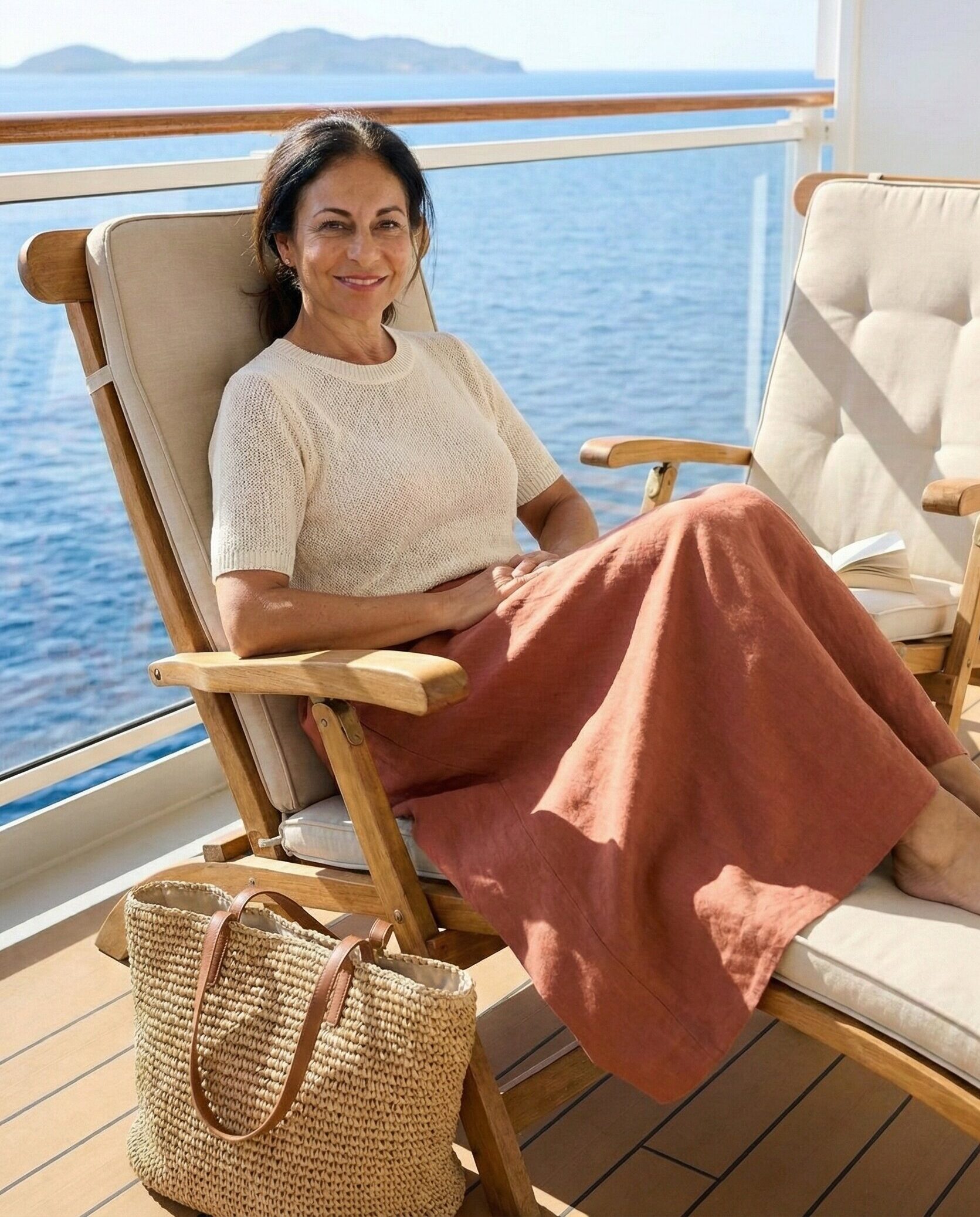 A long skirt combined with a lightweight knit top provides modest coverage while remaining comfortable. Choose breathable materials to stay cool. This outfit feels cozy yet elegant, making it suitable for quiet mornings, reading on deck, or casual dining.