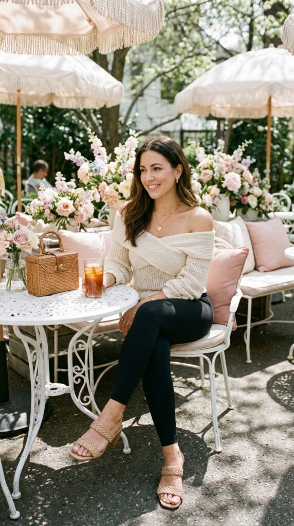 Pair black leggings with a soft off-shoulder top for a feminine touch. Add strappy sandals and delicate jewelry. This look is perfect for brunch dates and elevates your usual Cute Legging Outfits Summer.