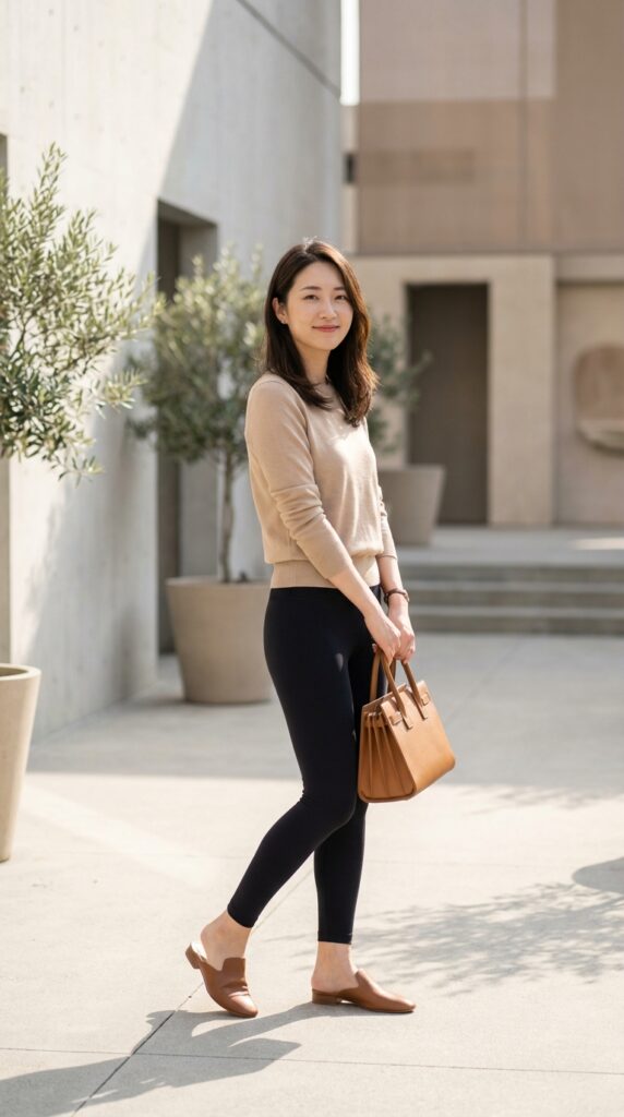 Opt for a thin knit top tucked into black leggings. Pair with open-back mules and a structured bag. This slightly elevated outfit proves leggings can look refined while staying within Black Leggings Outfit Casual territory.