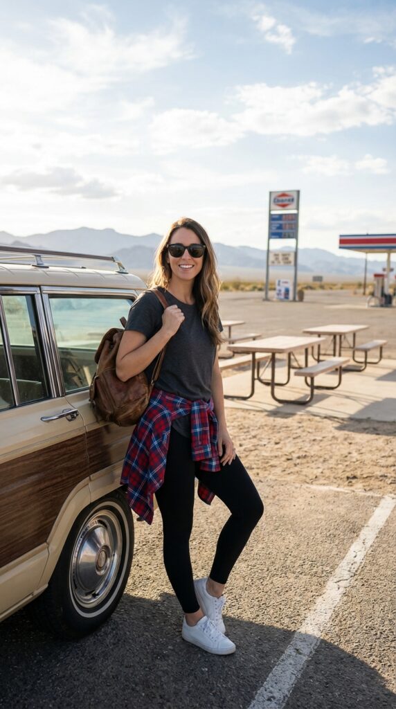 Style a plain tee with leggings and tie a flannel shirt around your waist for a casual edge. Add sneakers and sunglasses. This laid-back look is perfect for travel days or relaxed summer evenings.