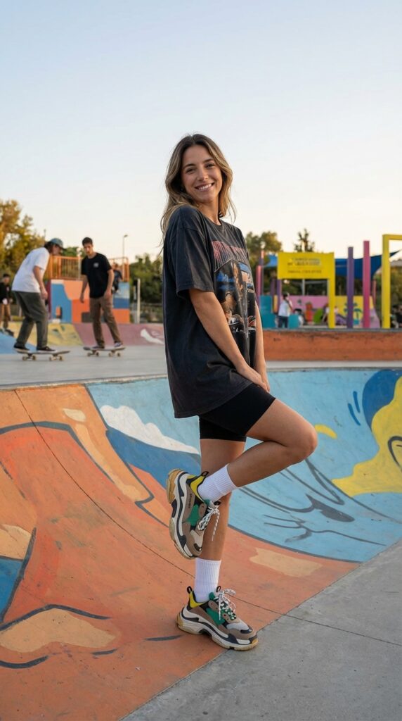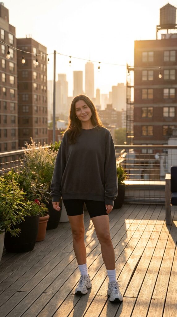 For cooler summer nights, pair biker-length leggings with an oversized sweatshirt. Add crew socks and sneakers. This cozy yet breathable look blends comfort with street-style, perfect for relaxed evening plans.