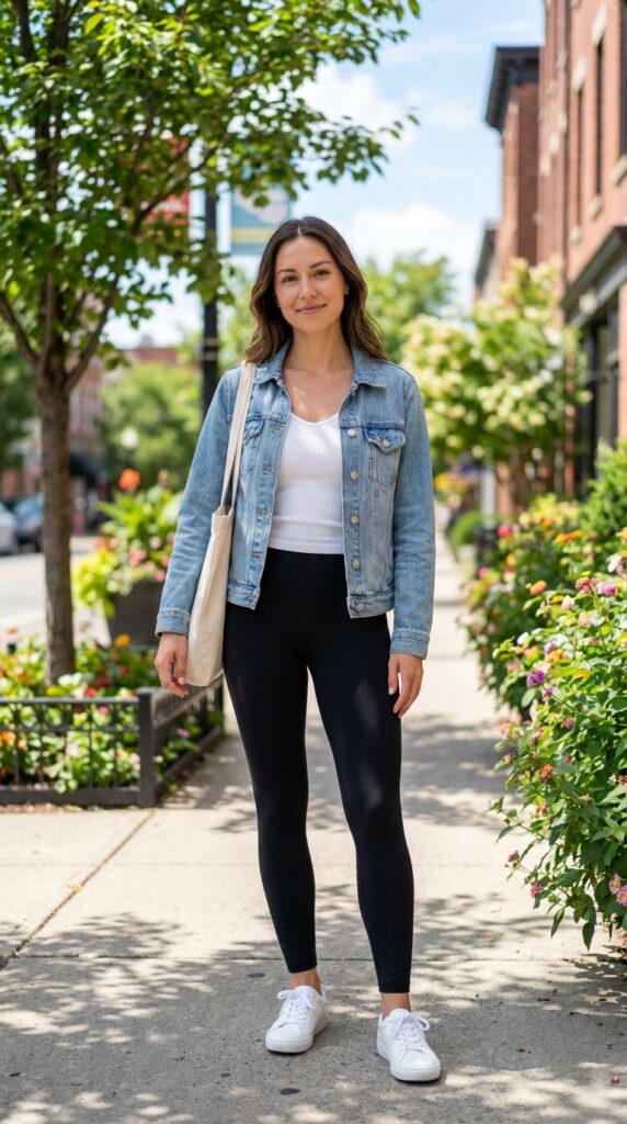 Wear a fitted ribbed tank with black leggings and throw on a light denim jacket. Add white sneakers and a tote bag. This outfit blends Black Leggings Outfit Spring into summer with a light layering trick.