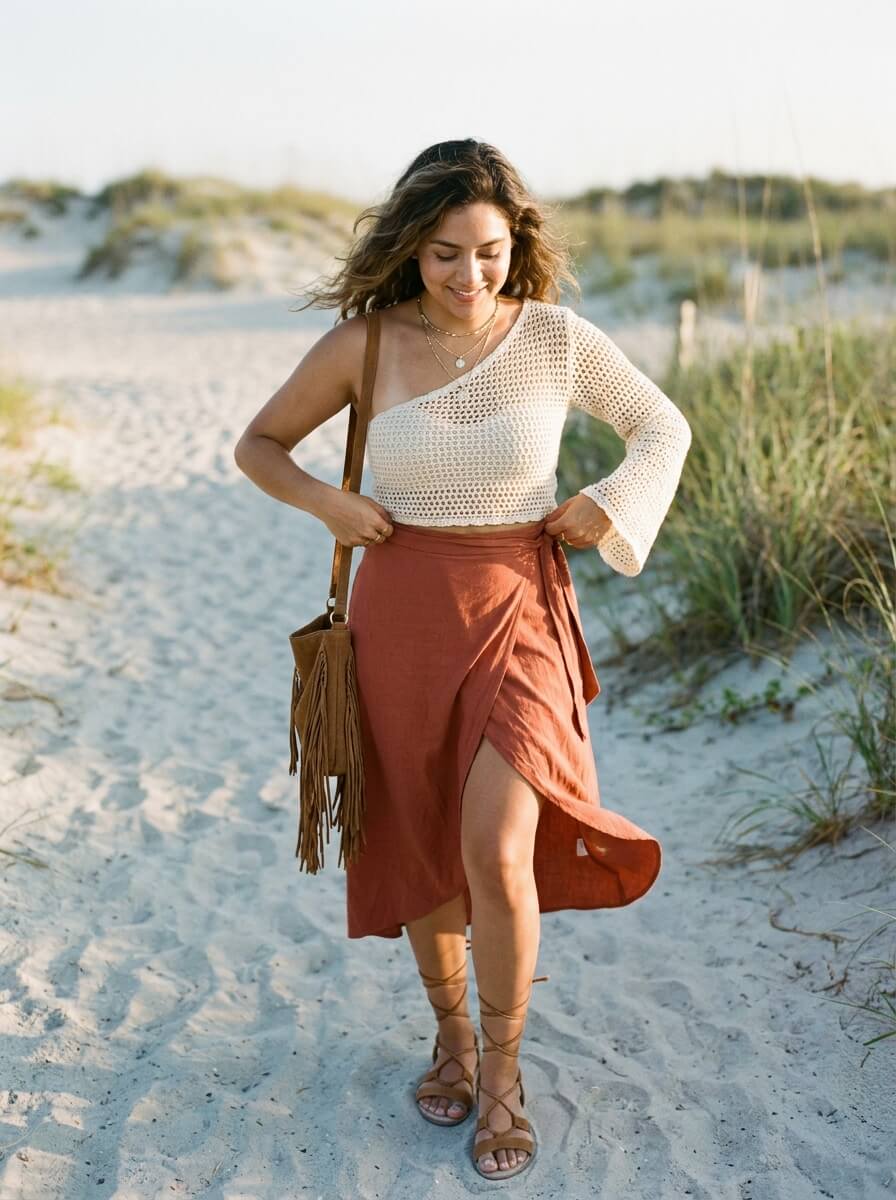 A draped one-sleeve crochet top styled with a high-slit wrap skirt in terracotta. Add leather lace-up sandals, a fringe bag, and layered necklaces. The asymmetrical crochet keeps the boho vibe elevated, not predictable.