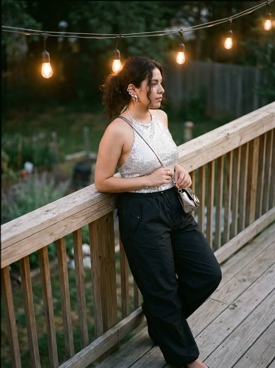 A liquid silver halter top paired with relaxed black parachute pants delivers contrast. Add strappy heels, a metallic mini bag, and bold ear cuffs. The sporty pant against the glam top makes this perfect for late-night deck moments.