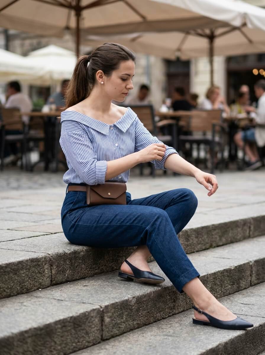 A striped button-down worn off one shoulder, tucked into high-rise tailored denim trousers. Add pointed slingback flats, a structured belt bag, and pearl studs. The undone shirt styling keeps it intentional, not messy.