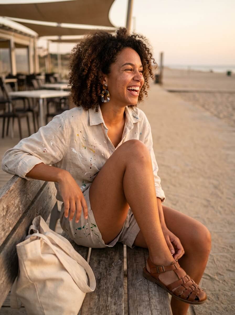 A paint-splatter linen co-ord—boxy shirt and relaxed shorts—styled with woven fisherman sandals. Add a canvas tote and colored resin earrings. The artistic print shifts this into wearable resort wear without looking predictable.