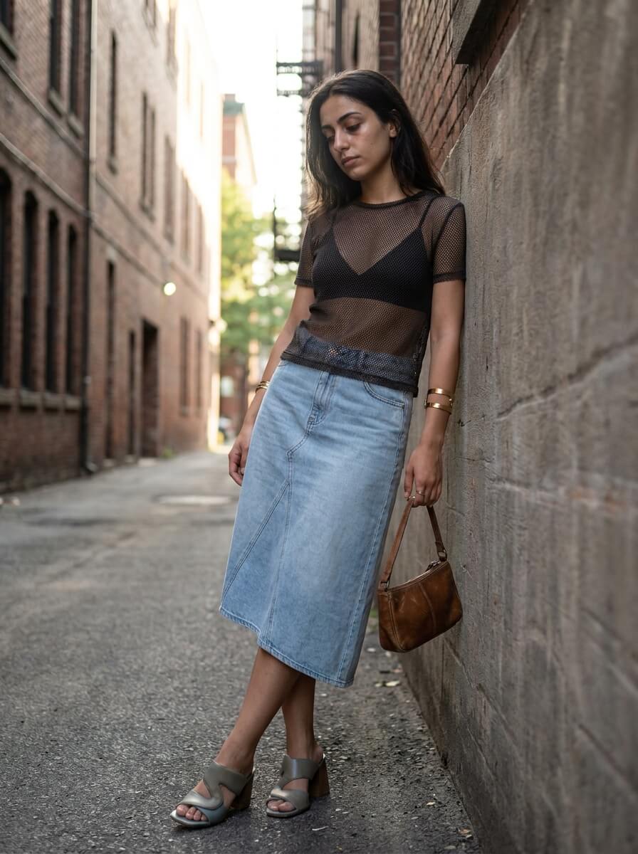 A sheer chocolate mesh long-sleeve layered over a bralette, styled with a light-wash asymmetrical denim midi skirt. Finish with sculptural heeled sandals, a mini leather bag, and bold gold cuffs. It’s edgy, breathable, and far from basic summer outfit ideas.