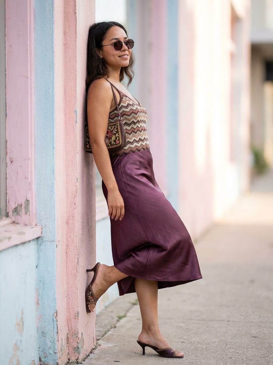 A multicolor zigzag knit tank paired with a bias-cut satin midi skirt in deep plum. Style with kitten heel mules, a mini shoulder bag, and tinted sunglasses. The texture clash makes this one of the most interesting summer outfit ideas onboard.