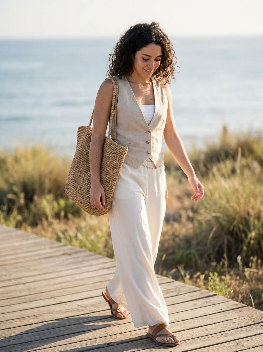A sand-toned sleeveless linen vest worn over a barely-there bandeau top, paired with flowy ivory palazzo pants. Ground it with leather toe-ring sandals, a slouchy raffia tote, and a slim waist chain. The vest-as-top twist makes this quietly standout.