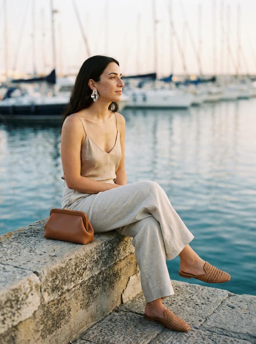 A sand-toned silk camisole paired with wide-leg linen trousers in the same shade creates tonal depth. Style with woven mules, a structured clutch, and sculptural earrings. The mix of textures keeps monochrome from feeling flat.