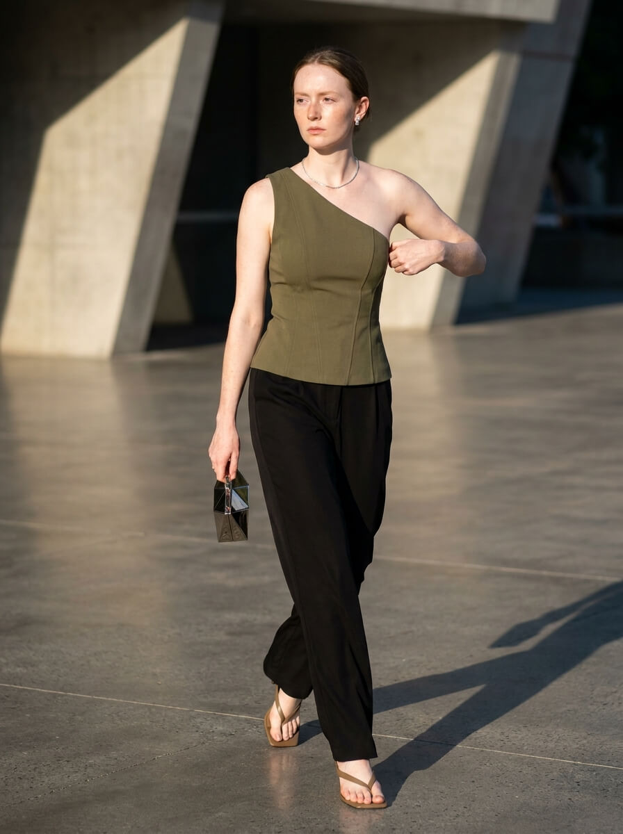 A structured olive one-shoulder top meets fluid black draped trousers with soft pleats. Pair with square-toe thong heels, a geometric clutch, and a single statement ring. The asymmetry gives minimalist dressing a fresh, architectural feel.