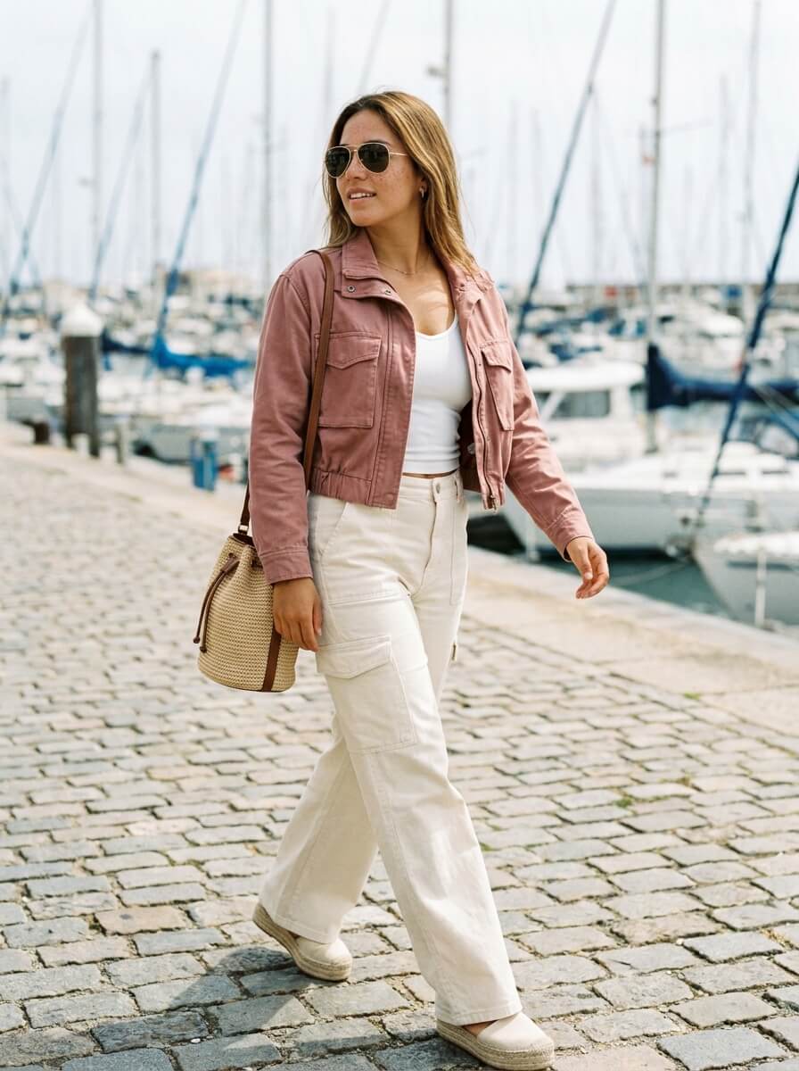 A cropped utility jacket in dusty rose layered over a fitted tank, paired with wide-leg cream cargo pants. Finish with platform espadrilles, a bucket bag, and aviator sunglasses. It blends structure and softness in a fresh way.