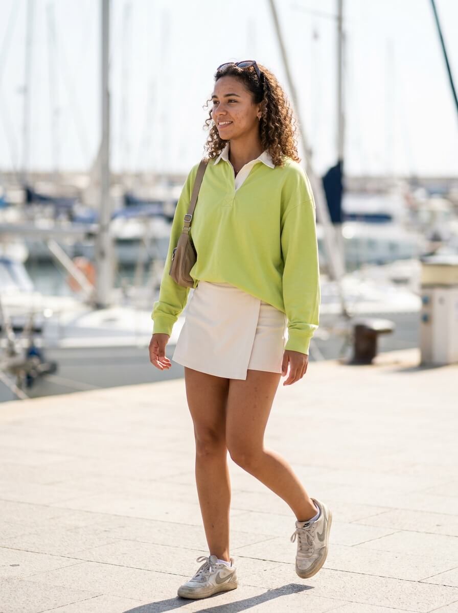 A zesty lime oversized rugby shirt half-tucked into tailored cream skorts creates contrast. Add retro running sneakers, a sporty nylon mini bag, and angular sunglasses. The rugby detail brings an unexpected prep-meets-sport energy to cute summer looks.