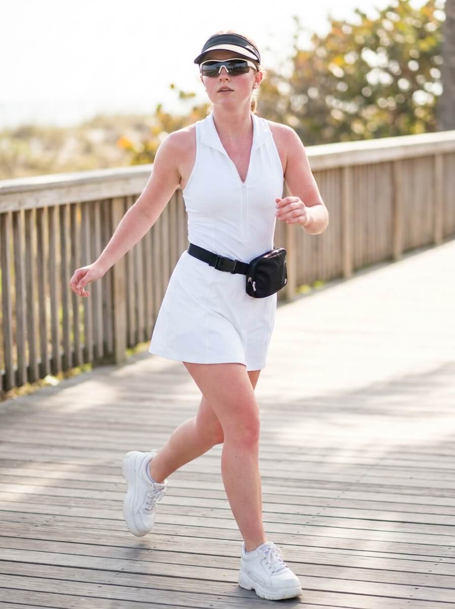 A sleeveless zip-front tennis dress in crisp white gets reworked with chunky platform sneakers. Add a crossbody belt bag and visor sunglasses. The athletic base turns into polished casual summer cruise outfits with the right accessories.