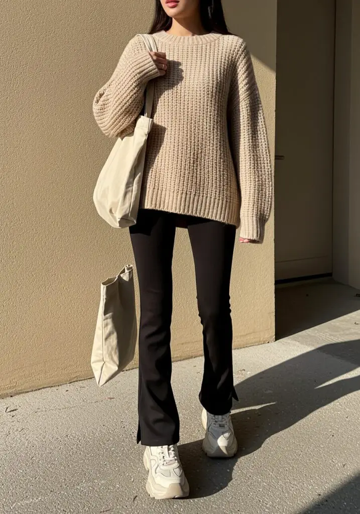 A cozy oversized knit sweater with black flare leggings gives instant comfort-chic energy. Add chunky sneakers and a sleek tote bag for that casual yoga pants outfit feel that still looks polished.