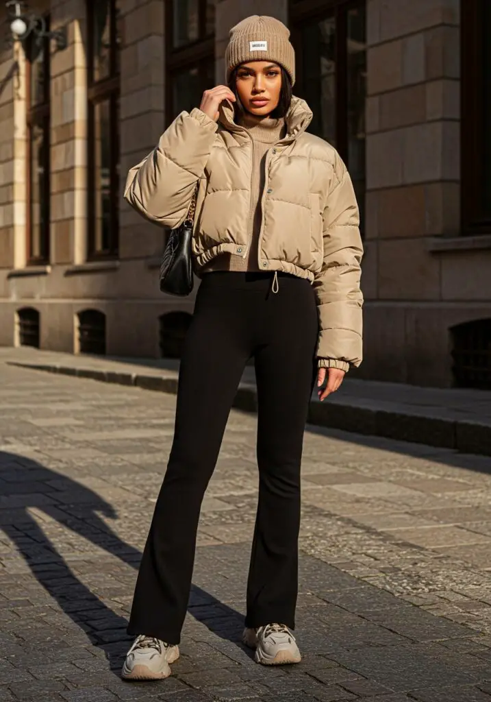 A cropped puffer with flare leggings instantly adds dimension. Pair with chunky sneakers and a beanie for a cool, cozy street-style statement.