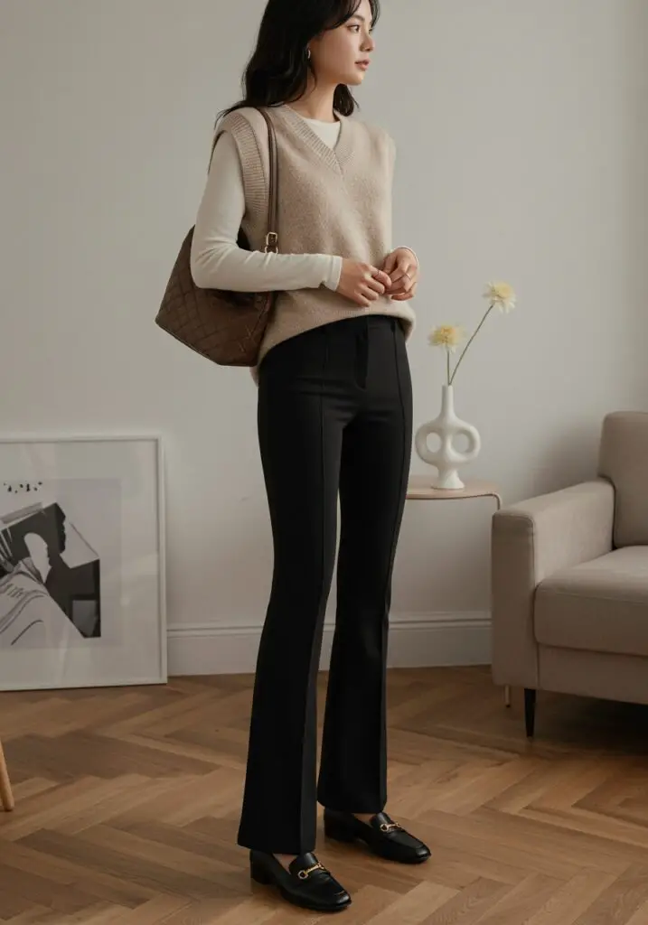Layer a neutral sweater vest over a white long-sleeve top with your flare leg pants outfit. Add loafers or low heels for an easy, polished finish.