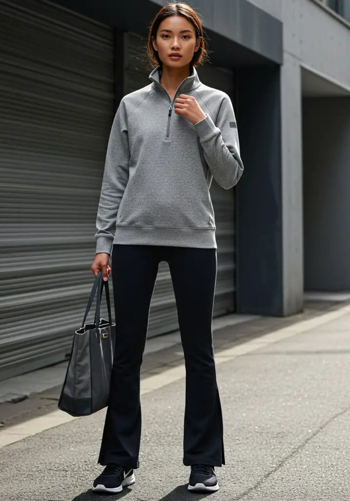 For a gym-to-street yoga pants outfit, wear a zip-up sweatshirt with black flare leggings. Add a sleek tote and running shoes for a sporty yet elevated look.