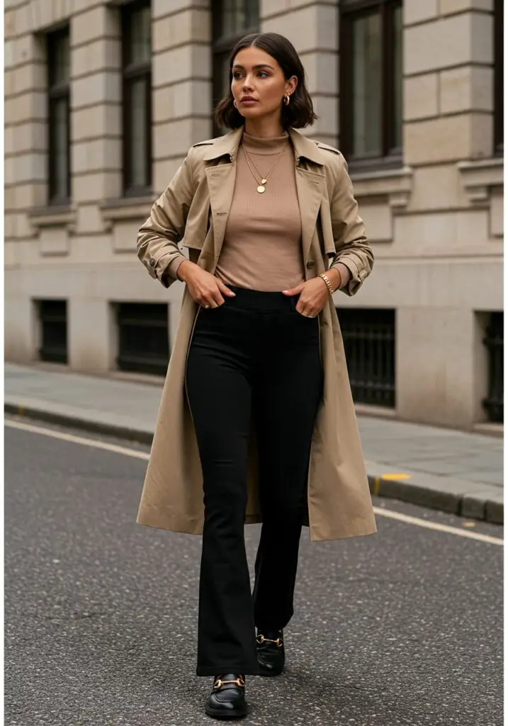 For a refined old money outfit, pair a beige trench coat with a mock neck top and black flare leggings. Finish with loafers and gold jewelry for timeless sophistication.