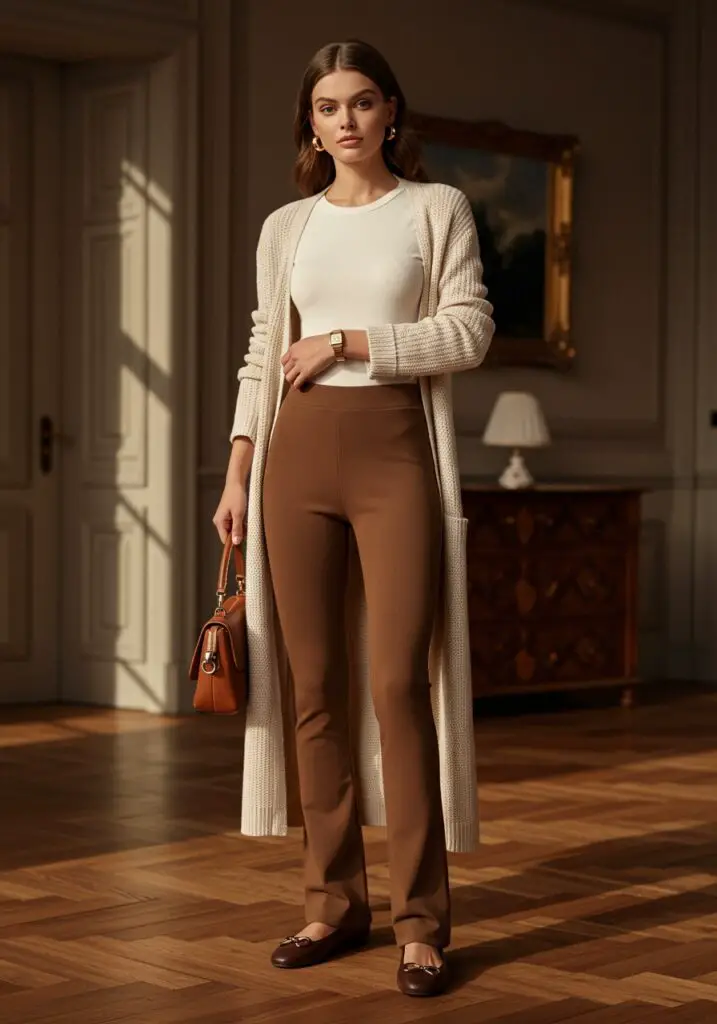 Brown flare leggings paired with a white tee and a long beige cardigan give that soft old money outfit vibe. Finish with loafers or ballet flats for a classy off-duty look.