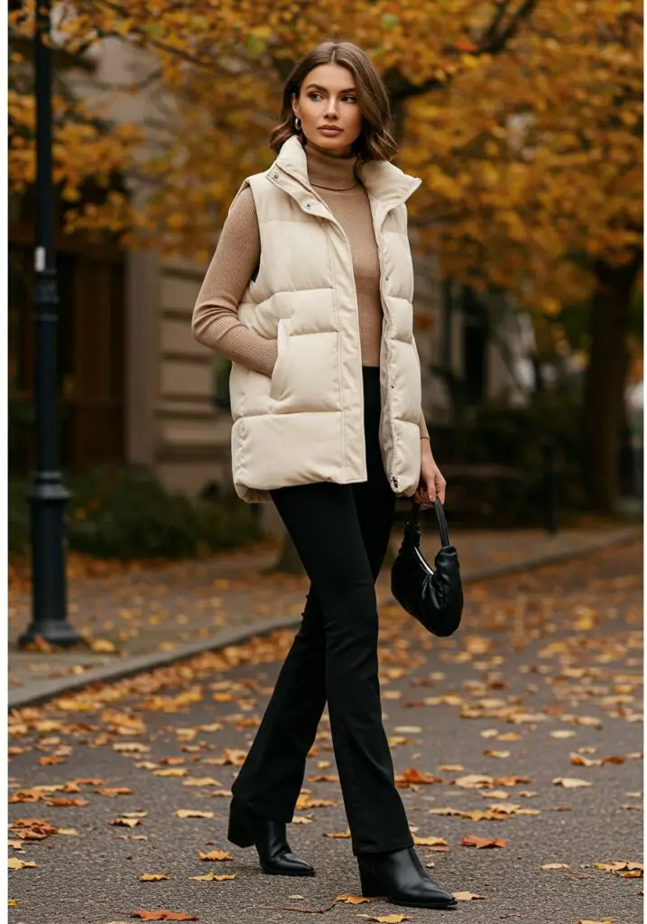 Perfect for colder days, a cream puffer vest over a fitted long-sleeve top pairs beautifully with black flare leggings. Add ankle boots and a crossbody bag for a warm, sleek finish.