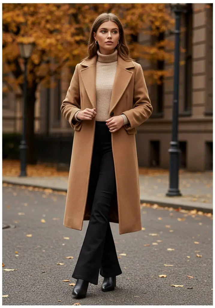 For a chic fall ensemble, wear a neutral turtleneck tucked into your flair leggings outfit and top it with a belted wool coat. Add heeled boots to elevate the look effortlessly.