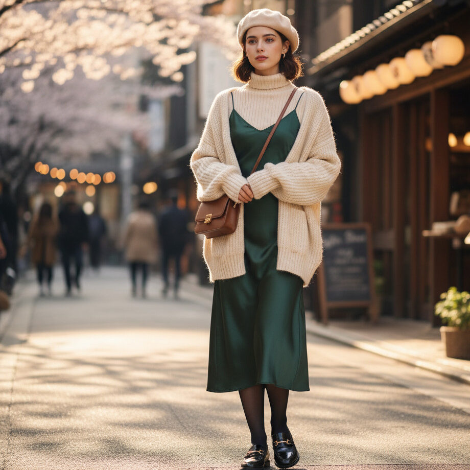 Try layering a turtleneck under a slip midi dress with a thick cardigan on top. Add tights, loafers, and a beret — a feminine twist on Japanese winter fashion loved by locals.