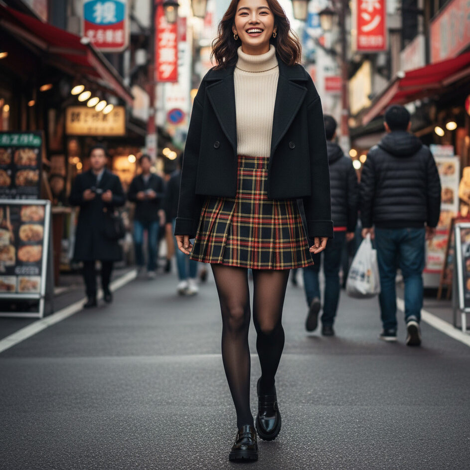 Cute and preppy — style a cream turtleneck, plaid skirt, tights, and loafers. Add a cropped coat for that Japanese winter fashion seen in Shinjuku boutiques.