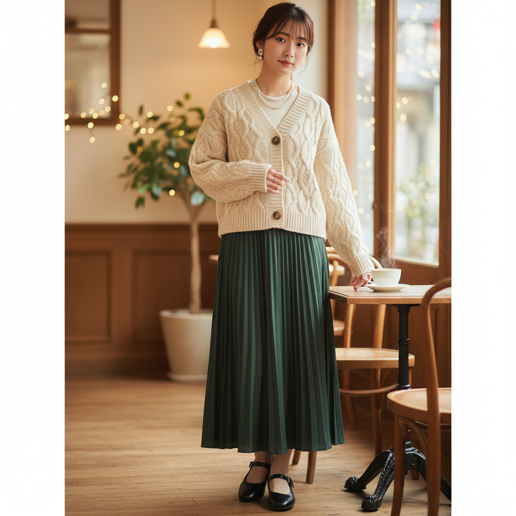 For cozy café days, wear a chunky cardigan, long pleated skirt, and Mary Janes. Add pearl accessories — the definition of dreamy 冬服 (winter clothes) style.