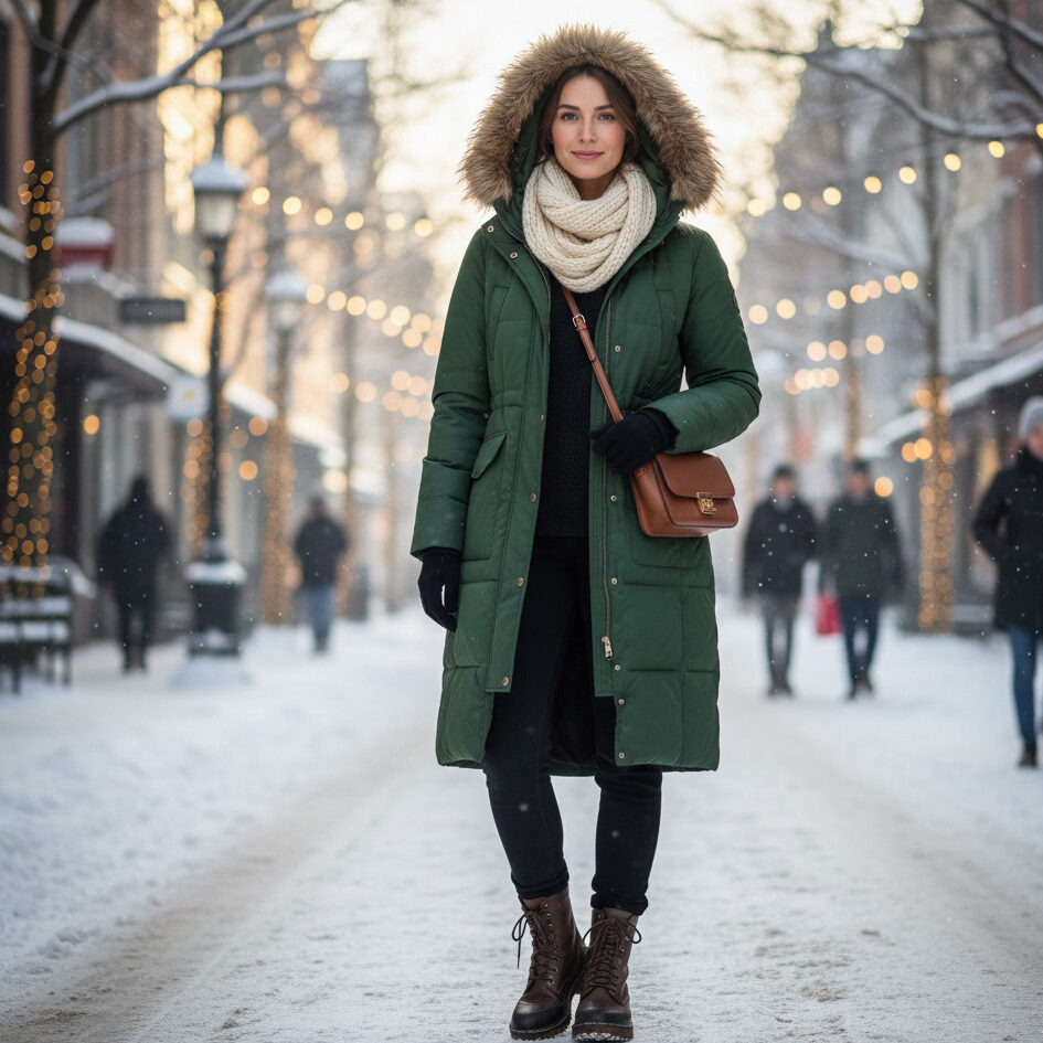 For outdoor days, wear a long parka, fleece-lined leggings, and waterproof boots. Add a crossbody and wool scarf — a practical cold weather outfit for exploring snowy spots.